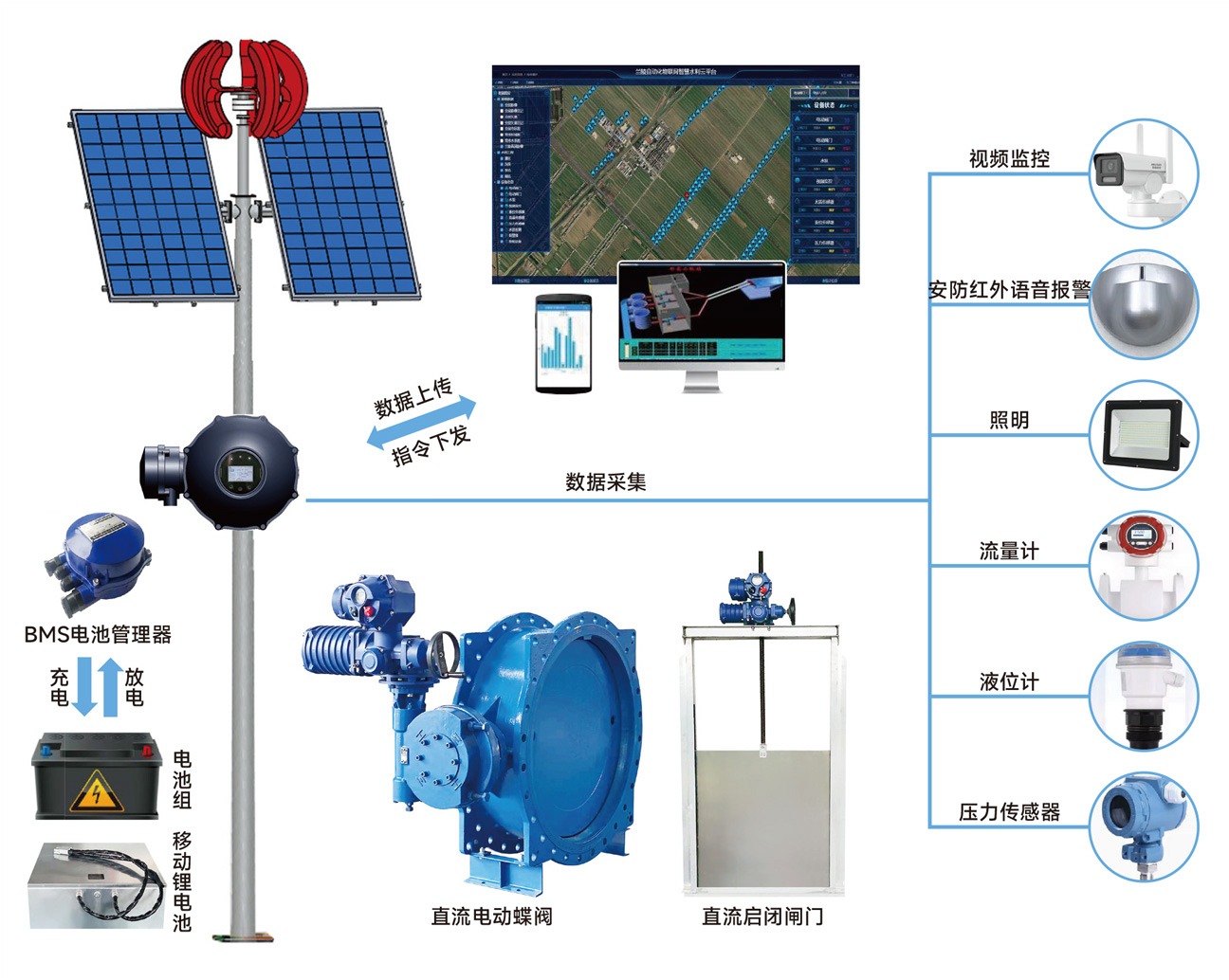 由太陽(yáng)能光伏板和小型風(fēng)力發(fā)電機(jī)為蓄能電池組充電,電池組有BMS電池管理軟件管控,為永磁無(wú)刷直流電機(jī)的各類(lèi)驅(qū)動(dòng)裝置供電,同時(shí)為視頻監(jiān)控,壓力、流量、液位傳感器,照明等供電
